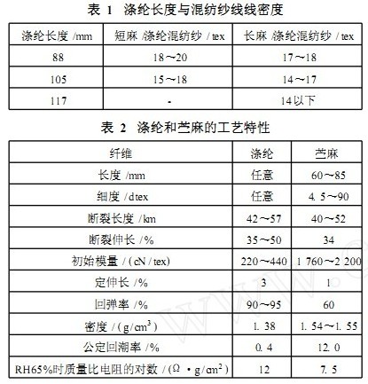 滌/麻混紡紗線的紡制一般借用精梳毛紡或者絹紡系統,只是在設備上作局部改進。原麻要先加工成精干麻,而短苧麻和落麻一般采用棉紡紡紗系統進行加工。
