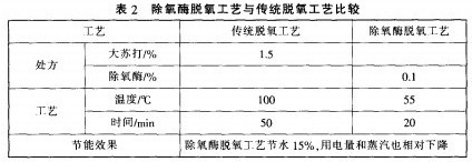 對于氧漂后的脫氧工藝.傳統脫氧工藝是應用大蘇打或其他化學品脫氧.脫氧效果不理想.且耗水量比較大。為了改善產品質量、降低能源消耗.采用生物酶脫氧工藝.可高效地將雙氧水分解為氧氣和水它具有專一性.僅作用于雙氧水.對染料沒有影響.所以脫氧后不用排水可以直接進行染色.既縮短了工藝時間.提高了工效.又減少了污水排放兩種工藝的比較見表2。