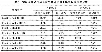 表3通過對7只活性染料的單色試驗發現.無鹽染色較常規有鹽染色的上染率提高9%~15%.固色率提高13%~23%