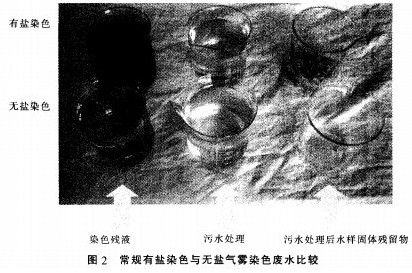由圖2可看出.常規有鹽染色要較無鹽染色的染色殘液色度高.無鹽染色的污水易處理.而常規有鹽染色污水處理后有大量的固體殘留物。