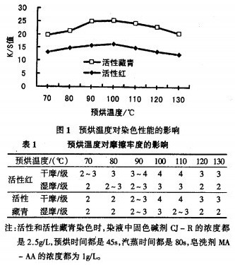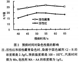 從圖l和表l可以看出,隨著預烘溫度的升高,織物的K/S值和摩擦牢度不斷增加,在達到一定預烘溫度后,織物的K/S值和摩擦牢度隨著預烘溫度的升高不斷下降。這是因為織物浸軋完染液后,進入預烘階段,預烘的目的主要有兩方面:一是提供纖維的溶脹和染料的滲透時間,確保染料正常擴散上染;二是盡量去除織物上的水分,特別是流動水和毛細管水,使織物濕度低于纖維臨界含水率。而在預烘過程中,預烘溫度太高,棉纖維的溶脹度相對較大,水和染料的活化能相對較低,毛細管顯著,染料的泳移程度增大。同時,溫度太高,可能會使部分染料和纖維在預烘時過早固色,不僅會導致固色率不高,而且染料的透染性差,纖維外層的固色量高,色牢度也不好。相反,織物的預烘溫度太低時,在相同的預烘時間內,織物的含水量較高,在汽蒸固色階段,染料較易發生水解,會導致染色織物的K/S值和摩擦牢度降