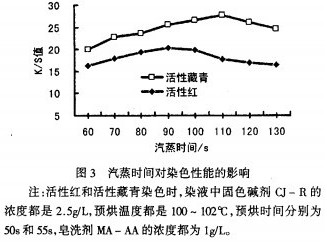 從圖3可以看出,隨著汽蒸時間的延長,染色織物的K/S值先不斷增加,在達到一定程度后,K/S值又呈下降趨勢。這是因為浸軋在織物上的染料在預烘時只有少量對纖維發生吸附、擴散和固著,在用飽和蒸汽汽蒸時,染料從蒸汽中吸收水分后擴散進入纖維間的毛細管中,在被纖維吸附的同時向纖維內部擴散,并發生固色反應j。織物的固色是一個過程,需要一定的時間,因此隨著汽蒸時間的延長,織物的得色量不斷增加,表現為K/S值的增加。然而到達一定汽蒸時間后,織物的得色量又呈下降趨勢。這可能是由于染料與纖維鍵合固著后,在繼續汽蒸的過程中,發生了不可逆的斷鍵水解造成的。因此,活性紅和活性藏青的汽蒸時間分別選擇為90s和ll0s。