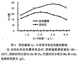 從圖4可以看出,隨著固色堿劑cJ—R濃度的增加,染色織物的K/S值先增加后降低。這是因為加入堿劑后,一方面促使纖維素纖維羥基離子化,加速了染