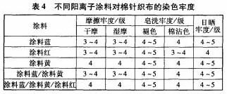 由表4可知,不同顏色的陽離子涂料對棉針織布進行染色并整理后,其干、濕摩擦牢度均能達到3~級,日曬牢度也能達到4級以上,不同涂料的皂洗牢度,有一定差別,但在半級以內,涂料紅染色的織物色牢度稍差一些,但也能達到3—4級。