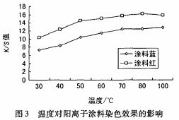 陽離子涂料用量15%、浴比1:15,以不同染色溫度分別處理60rain,水洗,烘干,測染色織物的K/S值,結果見圖3。