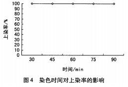 陽離子涂料藍用量為15%,染色溫度7O℃,浴比1:15,保溫不同時間。測定其上染率,見圖4。