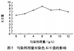陽離子涂料藍用量為5%,加人不同用量的勻染劑,浴比1:15,70oC保溫染色30min,測定K/S值,見圖5。