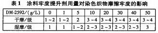 由表1可知,涂料牢度提升劑用量從1g/'L增至1Og/L時,摩擦牢度有一定的提高;用量大于10g/L后,摩擦牢度提高幅度較小。其原因可能是涂料牢度提升劑用量低于l0g/L時,不能完全占據織物表面,同時也說明涂料牢度提升劑與織物的結合是有限的,因此,涂料牢度提升劑用量以l0g/L為宜。