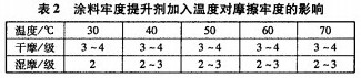 陽離子涂料藍用量為15%,涂料牢度提升劑DM一2592用量10g/L,于不同溫度加人涂料牢度提升劑,保溫20rain,脫水,烘干,分別測定染色織物摩擦牢度,結果見表2。