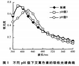 圖l為不同pH值下艾蒿提取液的吸收光譜曲線。由圖1可以看出,艾蒿提取原液的最大吸收波長(zhǎng)λMAX在380nm左右,在近紫外區(qū)域,這與較多的植物染料(如紅茶、大黃、槐米等)相似。艾蒿色素是以葉綠素為主的多種天然色素成分的混合物,組成較為復(fù)雜,其λMAX隨艾蒿產(chǎn)地、采摘季節(jié)、提取工藝等而發(fā)生變化。pH值為3的艾蒿提取液的λMAX在380nm左右,與原液相近,pH值為9的艾蒿提取液的&lambda