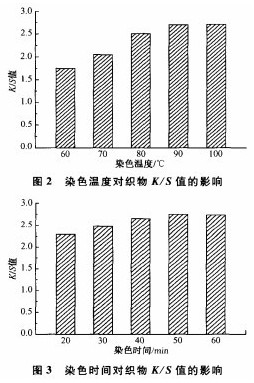 染色溫度及時(shí)問(wèn)對(duì)染色毛織物表觀色深值(K/S值)的影響見(jiàn)圖2、3。由圖2可知,隨染色溫度的升高(染色時(shí)間60min),染色針織物K/S值增大,當(dāng)溫度達(dá)90℃時(shí),K/S值增加緩慢,考慮到節(jié)約能源及可操作性,確定染色溫度9O℃。圖3表明,染色初期染色織物的K/S值隨時(shí)間延長(zhǎng)而增加(染色溫度90℃),當(dāng)染色50min時(shí),再增加染色時(shí)間,K/S值變化不大,表示染色反應(yīng)已基本達(dá)到平衡。據(jù)此,確定最佳染色時(shí)間為50min。