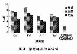 不同媒染劑及媒染工藝對(duì)染色織物K/S值的影響見(jiàn)圖4。從圖4可知,采用媒染劑的染色樣品的K/S值均大于直接染色樣品,說(shuō)明媒染劑有效增加了染色深度。對(duì)同~媒染劑,織物K/S值順序?yàn)椋侯A(yù)媒染色>后媒染色>同浴媒染>直接染色,預(yù)媒法得色最深,直接染色得色最淡,但染色過(guò)程中發(fā)現(xiàn),預(yù)媒法的勻染性能不好,個(gè)別染樣存在色花的現(xiàn)象。不同媒染劑對(duì)染色織物K/S值的影響是,預(yù)媒染色: Fe>Cu>Sn>A1,后媒染色:Cu>Fe>Sn>A1。總體來(lái)說(shuō),F(xiàn)e和cu的增深性能最好,Sn2+媒染3種媒染工藝的K/S值相差最小,媒染工藝對(duì)sn媒染樣品的K/S值影響不顯著.