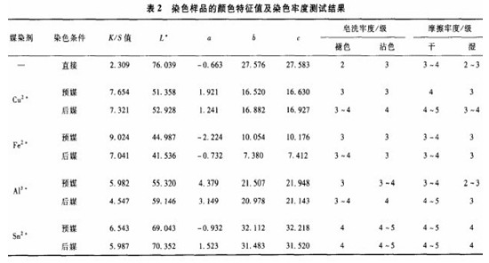 由表2可以看出,與直接染色相比,F(xiàn)e作為媒染劑對(duì)染色織物的顏色特征值影響最大,織物色光發(fā)生明顯變化,紅綠值。下降,綠光加重,黃藍(lán)值b明顯下降,黃光減弱,織物色光由直接染色時(shí)的綠光黃轉(zhuǎn)變?yōu)槟G色,亮度值下降明顯,色度值c下降顯著,羊毛織物經(jīng)Fe2+媒染后鮮艷度下降;Cu2+媒染樣品b值降低,藍(lán)光增加,色度值C下降,鮮艷度降低;而Al2+媒染紅光加重,染色織物呈磚黃色;Sn媒染的、。、b、c值變化很小,說(shuō)明織物色光變化不大。同一媒染劑的不同染色工藝,其色度指標(biāo)變化很小,說(shuō)明媒染工藝對(duì)織物色光影響不大。表2還說(shuō)明,對(duì)同一媒染劑,染色牢度順序?yàn)椋汉竺饺旧?gt;預(yù)媒染色>直接染色;對(duì)不同媒染劑,以sn2+的染色牢度最佳,各項(xiàng)牢度在4級(jí)以上,Cu2+、Fe2+各項(xiàng)牢度大于3級(jí),可以滿足一般的牢度要求。