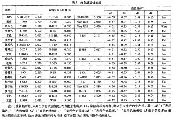 (1)1kg染缸染色采取了與染色大生產完全一致的染色工藝,而化驗室復色時由于受設備條件的限制,加料時間不可能與大生產完全一致(如1