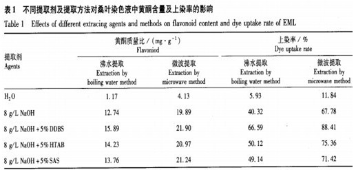根據(jù)直接觀察提取液的色深以及調(diào)查上染率的結(jié)果,均表明以堿溶液作為提取劑的染色效果最好,而以水、酸作提取劑的染色效果很差。采用100—200g/LNaOH均可有效提取和保存染色液,其中又以200g/LNaOH提取的桑葉染色液