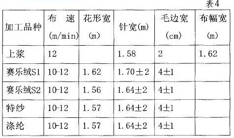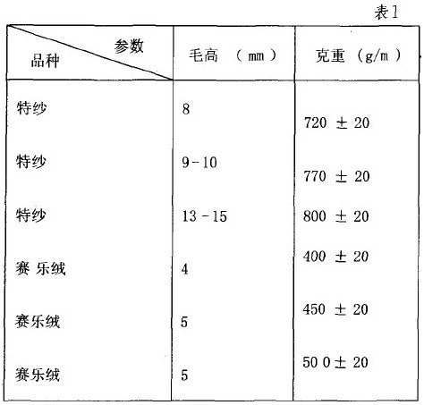 除毛高、克重符合表1要求之外, 還要檢查幅寬 1 58cm且是否均勻一致,邊緣是否整齊;長度要求30m 左右;無斷紗;無橫路;斷針要求<40cm:油污以不影響毛面印花為準;底膠均勻,不透膠不學習漏膠,硬度符合要求。