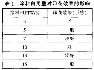 4.1 遮光涂料的選擇和用量是影響印花效果的主要因素 選擇涂料白FTW 作遮光劑.并控制其用量為l0%.將獲得良好的朦朧效果。