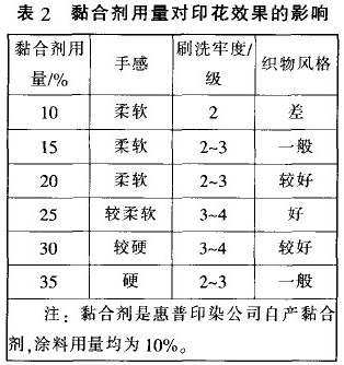 考慮印花后要經過皂洗工序.應該將涂料印花黏合劑用量適當提高。為此.做了黏合劑用量的對比實驗.結果見表2。