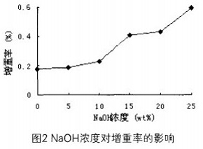 (2)隨著NaOH濃度的增加,絲膠蛋白氧化棉纖維的增重率不斷增加。