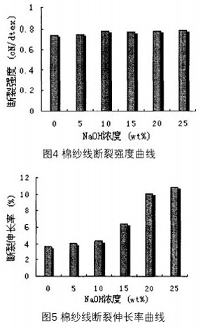 (4)經不同堿濃度預處理,蛋白氧化棉紗線的斷裂強度基本不變。而其斷裂伸長率隨著堿處理濃度增加而增加,并在堿濃度為lOwt%增加明顯。
