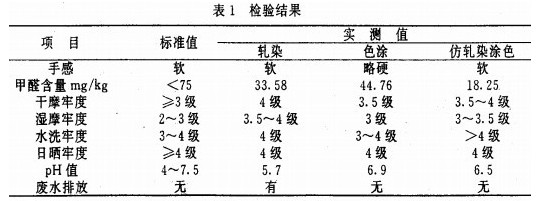 通過上表比較可以看出,仿軋染棉織物牢度、pH值、甲醛含量等指標(biāo)均達(dá)到標(biāo)準(zhǔn)要求,且涂飾后的產(chǎn)品手感好予涂料涂色產(chǎn)品,牢度等指標(biāo)達(dá)到或接近染料染色水平,且無(wú)廢水排放。總之,棉織物仿軋染生產(chǎn)的產(chǎn)品手感柔軟,色光好,織物紋理感強(qiáng),干濕摩牢度均可達(dá)到較