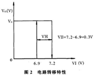控制部分使用CMOS集成電路CD4093組成檢測,延時功能。CD4093是2輸入端4與非施密特觸發器。(圖1中只畫出3只門電路,不使用的門電路輸入端要接固定電平,實際電路中1、2接4腳,3腳懸空。這一部分在圖1中沒有表示出來。)在本電路中將與非門2輸入端并聯作非門使用,色漿液位探頭由8腳管座5接人,經過阻容濾波,去除外界干擾,加至輸入端12、13腳,經過2次反相,第10腳輸出。由圖l所示,10~l2、13腳之間接有1M 電阻,使這2只非門組成具有回差的施密特觸發器。實測探頭電位在>7.2 V 或<6.9 V 時門輸出跳變,與第10腳輸出關系,形成回差電壓,約0.3 V。電路轉移特性如圖2。當輸入信號電壓在6.9~7.2 v 之間變化時,輸出保持原狀態不變化,提高了輸入信號的抗干擾能力。