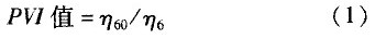 式(1)中,PVI 是印花黏度指數(shù), η60和η6 分別是轉(zhuǎn)速為60 r/min和6 r/min時(shí)的原糊黏度。