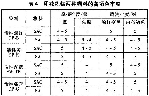兩種糊料不同顏色印花織物的耐洗及耐摩擦牢度如表4。