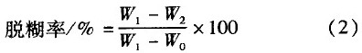 (2)脫糊率測(cè)試將織物烘至恒重,置于干燥器中冷卻,分別稱得印花前織物重w0,印花后未皂洗織物重w1,皂洗后織物重w2。按式(2)計(jì)算脫糊率: