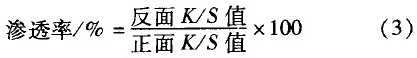 (3)K/S值、滲透率和色澤不勻度用電子測(cè)色配色儀測(cè)定印花織物花紋處的K/S值;由正反面的K/S 值按式(3)計(jì)算滲透率: