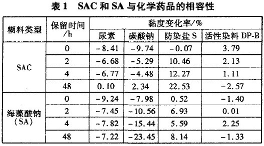 由表1可知,SAC原糊對(duì)各類化學(xué)藥品的穩(wěn)定性,總體好于海藻酸鈉原糊,而且放置時(shí)間越長(zhǎng),優(yōu)勢(shì)越明顯。由此可見,SAC對(duì)活性染料印花用的化學(xué)藥品有很好的適應(yīng)性,容易制得穩(wěn)定的印花色漿。