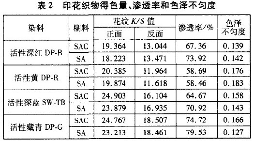 分別用活性深紅DP—B、活性黃DP—R、活性深藍(lán) SW—TB和活性藏青DP—G在平紋棉織物上印花,測(cè)試印花織物正反面的K/S值、色澤不勻度及滲透率情況,見表2。