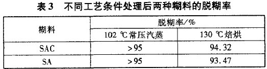 表3中,102℃常壓汽蒸是活性染料印花最常用的固色條件,在此條件下,SAC糊和sA糊均可達(dá)到較理想的脫糊率(大于95%)。經(jīng)130℃ 焙烘處理后, SAC脫糊率仍達(dá)94.32%,略高于sA糊。