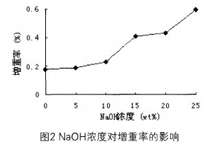 (2)隨著NaOH濃度的增加,絲膠蛋白氧化棉纖維的增重率不斷增加。