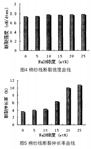 (4)經不同堿濃度預處理,蛋白氧化棉紗線的斷裂強度基本不變。而其斷裂伸長率隨著堿處理濃度增加而增加,并在堿濃度為lOwt%增加明顯。