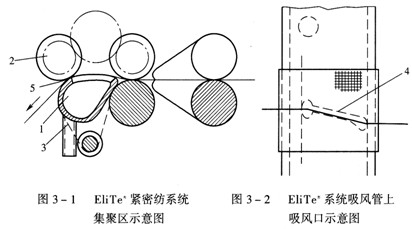 日本豐田公司的EST型吸風(fēng)管單用型緊密紡系統(tǒng)中(圖3—3),原牽伸裝置保持不變,在原前羅拉1的前方加裝一根輸出羅拉3,在輸出羅拉3與前羅拉1之間設(shè)置一根與輸出羅拉3圓