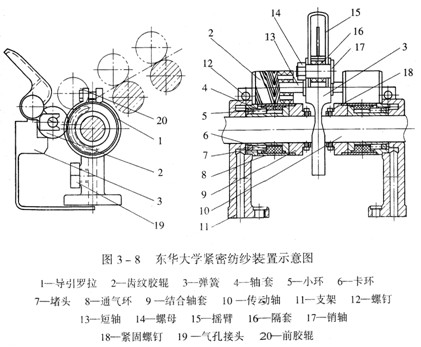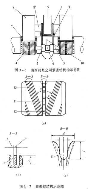 這種齒紋膠輥(溝槽羅拉)集聚機(jī)構(gòu)是一種機(jī)械集聚型緊密紡系統(tǒng),按理說(shuō),不屬于本節(jié)“吸風(fēng)集聚機(jī)構(gòu)”的技術(shù)內(nèi)容,但考慮到該技術(shù)同樣是由山西鴻基公司與東華大學(xué)合作新開(kāi)發(fā)的“細(xì)紗機(jī)用羅拉集聚紡紗裝置”(ZL02200281.2;圖3—8),同時(shí)該技術(shù)與3.1.3.1所述的“氣流槽聚纖維須條集聚裝置”具有淵源關(guān)系(圖3—9),故安排在此處一并詳細(xì)說(shuō)明。
