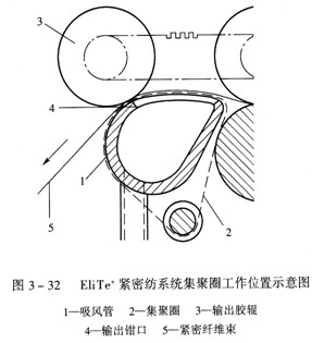 在吸風(fēng)管兼用型吸風(fēng)集聚機(jī)構(gòu),例如EliTe®緊密紡系統(tǒng)運(yùn)行時(shí),集聚圈2套在吸風(fēng)管1上,受輸出膠輥3壓力作用,由輸出膠輥3驅(qū)動(dòng),隨著輸出膠輥3的線速度轉(zhuǎn)動(dòng)(圖3—32);與此同時(shí),粗紗條經(jīng)后、中、前羅拉牽伸到一定細(xì)度之后進(jìn)入集聚區(qū),纖維須條在集聚圈2的表面上同集聚圈2一起向前移動(dòng)。在此過程中由于集聚圈2內(nèi)的吸風(fēng)管1及其對(duì)位設(shè)計(jì)的吸風(fēng)口,因而在負(fù)壓氣流作用下須條收縮緊密,大多數(shù)暴露在須條外面的毛羽可在氣流和吸風(fēng)口結(jié)構(gòu)形狀的共同作用下埋人須條,完成集聚過程,成為須條緊密、毛羽減少、具有一定強(qiáng)力的緊密纖維束5,并由輸出鉗口4輸出。由此可見,集聚區(qū)內(nèi)
