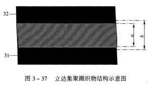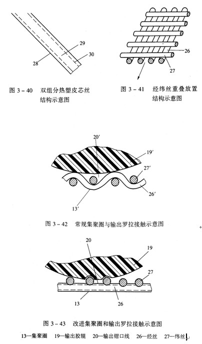 在一件名為“用于輸送一根纖維須條的輸送帶”的專利申請(qǐng)中,立達(dá)公司還提出了一種集聚圈的新技術(shù)方案:采用雙組分的熱塑性皮芯復(fù)合長(zhǎng)絲為經(jīng)緯絲來制造集聚圈。熱塑性長(zhǎng)絲28的表層30具有可熔性,芯層29為不可熔融或者熔點(diǎn)更高的組分(圖3—40);經(jīng)絲26、緯絲27重疊放置,其中緯絲27與纖維須條輸出方向垂直,并配置于集聚圈的外表面,即與集聚纖維接觸面(圖3—41),通過加熱使長(zhǎng)絲表層30熔融而使經(jīng)緯絲26、27相互固定結(jié)合,不熔融的芯層29可保證集聚圈的形狀穩(wěn)定性。通過這種方法,在保持集聚圈所要求的透氣性的同時(shí),可使集聚