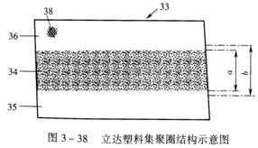 該專利同時(shí)提出一種塑料集聚圈的設(shè)計(jì)(圖3—38):集聚圈可由薄的塑料帶33制成,較窄的工作區(qū)34設(shè)有微孔,并盡可能與織物圈的通氣孔一致,而邊緣區(qū)域35、36不帶微孔,但在該處集聚圈的傳動(dòng)表面壓有特殊結(jié)構(gòu)的網(wǎng)紋或輕度滾花38等,以獲得較大的傳動(dòng)摩擦因數(shù)。同樣集聚圈的透氣性工作面寬度。比吸風(fēng)管的吸風(fēng)區(qū)域?qū)挾?b略小。