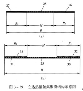 在另一件名為“輸送待集束的纖維條子的輸送帶”的專利文獻(xiàn)中圖3—39),立達(dá)公司又提出了一種完全由熱塑塑料絲織成的集聚圈。該集聚圈由單絲編織成無縫的圓筒形;中間透氣區(qū)25較窄,其寬度M為集聚圈寬度B的2/5;邊緣區(qū)域26、27通過加熱可變成不透氣的平滑片,其寬度分別為R1和R2;或者在該F層邊緣區(qū)域30、31采用熱熔膠涂層32、33。集聚圈的工作區(qū)與邊緣區(qū)域由一種織物制成,擁有更高的形狀穩(wěn)定性,較窄的透氣區(qū)使沉積于集聚圈的雜質(zhì)減少,不透氣的邊緣區(qū)使集聚圈的使用壽命增加。