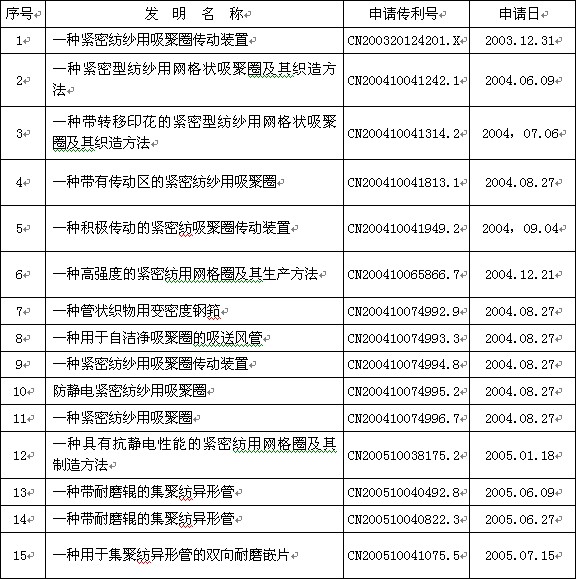 無錫集聚紡織器械有限公司是一家專門從事緊密紡技術(shù)及相關(guān)器械研制和銷售的高新技術(shù)企業(yè)。該公司已研制出多種緊密紡用集聚圈及其相關(guān)機(jī)件,并已申請(qǐng)和獲得多項(xiàng)國(guó)家專利(表3—3),因此也可以說是一家集聚圈專件的高新技術(shù)企業(yè)。
