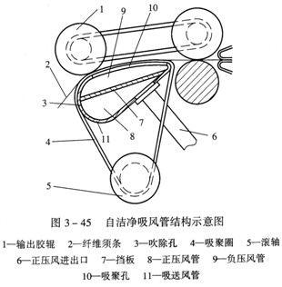 對(duì)于集聚圈的清洗,機(jī)械清洗自然比人工好,但換一種思路是:不清洗更好。無錫集聚紡織器械有限公司就針對(duì)集聚圈的清洗問題,提出了“一種用于自潔凈吸聚圈的吸送風(fēng)管”的專利設(shè)計(jì)方案。該發(fā)明設(shè)計(jì)方案是(圖3—45):吸送風(fēng)管11由擋板7分隔開的正壓風(fēng)管8