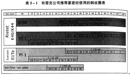 瑞士布雷克公司根據三十多家紡紗廠提供的數據進行了匯總,以反映大多數用于緊密紡的鋼絲圈使用情況,并依此推薦了適用于不同機型緊密紡工藝的鋼絲圈(參見表5—1),可供參考。