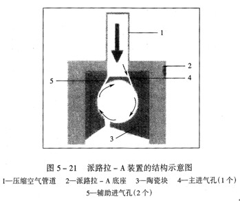 派路拉—A去毛羽裝置主要由壓縮空氣管道1、底座2、陶瓷塊3、主進氣孔(噴嘴)4、輔助進氣孔(噴嘴)5等構成(圖5—21)。其工作原理是:當管紗高速通過派路拉—A去毛羽裝置的陶瓷塊3的中腔時,壓縮空氣開關自動打開,壓縮空氣經壓縮空氣管道1由主進氣孔4進入陶瓷塊3的中腔中,由于主進氣孔4的結構設計可使進入陶瓷塊3中腔的壓縮空氣快速形成高速旋轉的氣流(即渦流)。在高速旋轉氣流的作用下,紗線的毛羽特別是較長的毛羽,會繞著紗線主干進行旋轉并包裹到紗