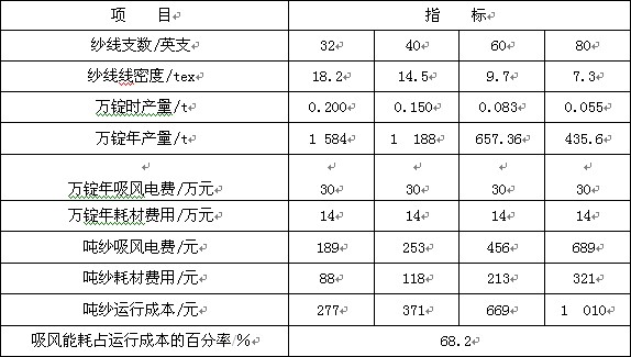 ①假設吸風電動機的能耗每萬錠約為70kW/h,以電價0.55元/ kW•h、年工作330d、每天工作24h計,則吸風電動機每年的萬錠能耗費用約為30萬元,計算過程如下: