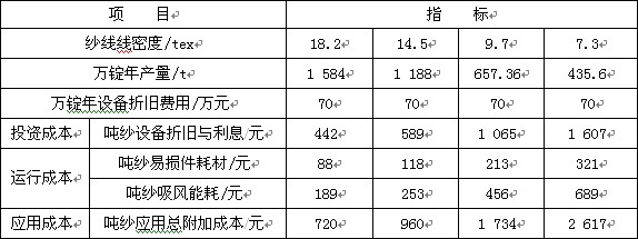 ②假設集聚圈單價為5元,使用壽命6個月,則萬錠緊密紡設備的集聚元件年消耗費用為10萬元:5×(12÷6)×10 000=100 000 (元)。