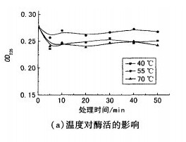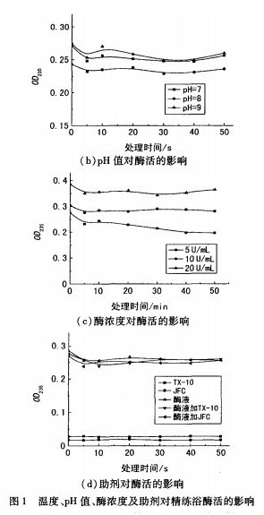 棉針織物生物酶精練浴中的酶活,直接影響其精練效果。因此,應(yīng)在酶精練過程中隨時(shí)檢測(cè)酶活,以便更好地控制反應(yīng)條件,使精練浴中的酶活保持穩(wěn)定,從而確保織物處理效果的一致性。由于酶的催化作用只有在適宜的條件范圍內(nèi)才能充分發(fā)揮,因此本試驗(yàn)在不同條件下[溫度、pH值和酶濃度,以及有否添加助劑(乳化劑TX-10和滲透劑JFC)