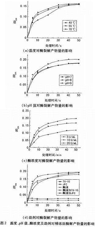 二或三半乳糖醛酸。因此,在棉針織物酶精練過程中,掌握精練浴中酶解產(chǎn)物不飽和半乳糖醛酸量的變化具有重要意義,可以更好地了解反應(yīng)進(jìn)程及精練效果。本試驗(yàn)在不同條件下[溫度、pH值和酶濃度,以及有否添加助劑(TX一10和JFC)]進(jìn)行棉針織物果膠酶精練,監(jiān)測(cè)精練浴中果膠酶裂解產(chǎn)物不飽和半乳糖醛酸量的變化,結(jié)果見圖2。