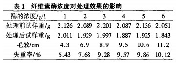 固定浴比1:20,處理時間60mJn,溫度50℃,pH7,JFC 1g/L,改變纖維索酶濃度對處理效果的影響結果見表1。